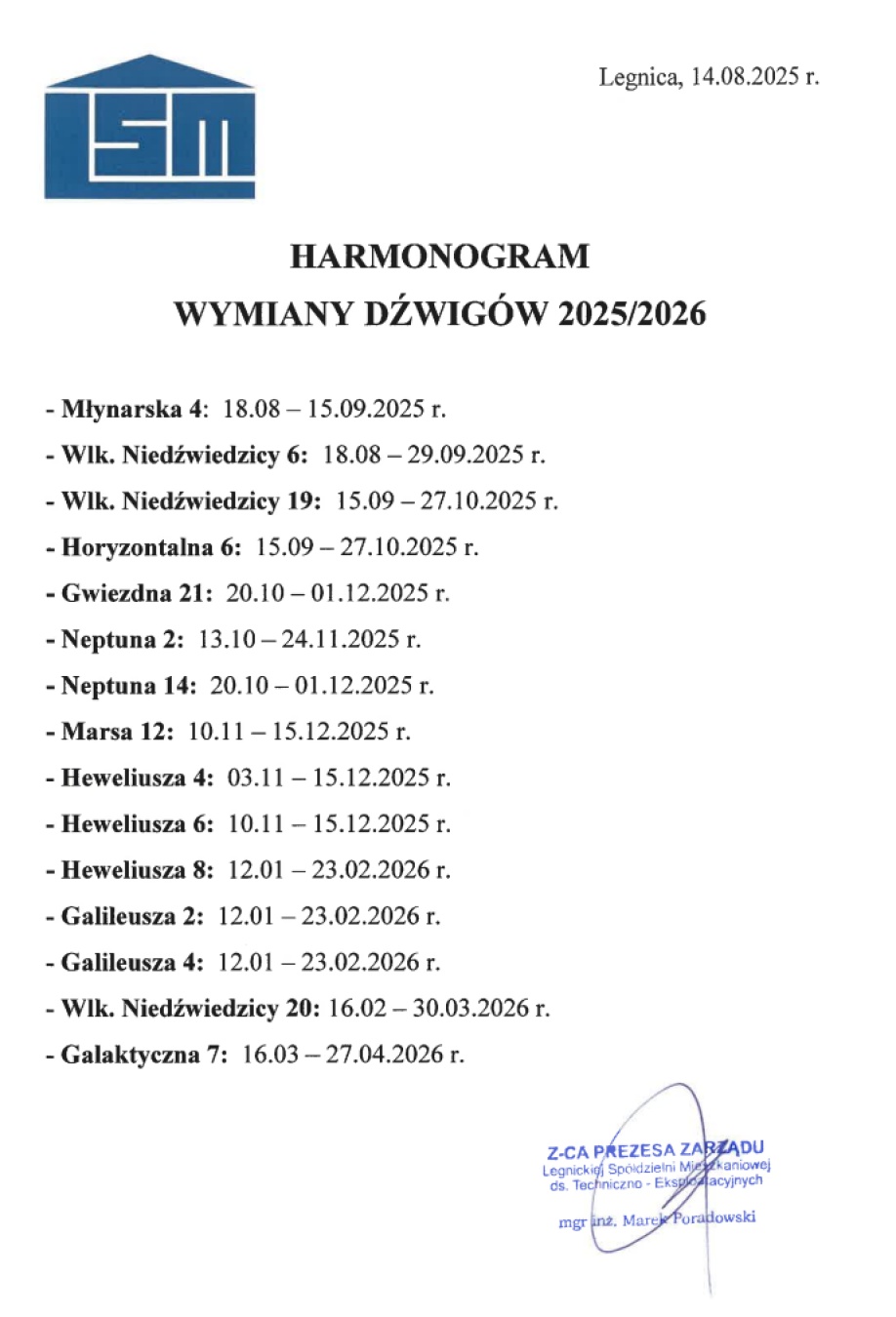 07 Sie Harmonogram wymiany dźwigów sierpień 7, 2025 wielkość czcionki Zmniejsz czcionkę Powiększ czcionkę Wydrukuj Email Tweet Dział: Komunikaty Czytany 260 razy Powrót na górę