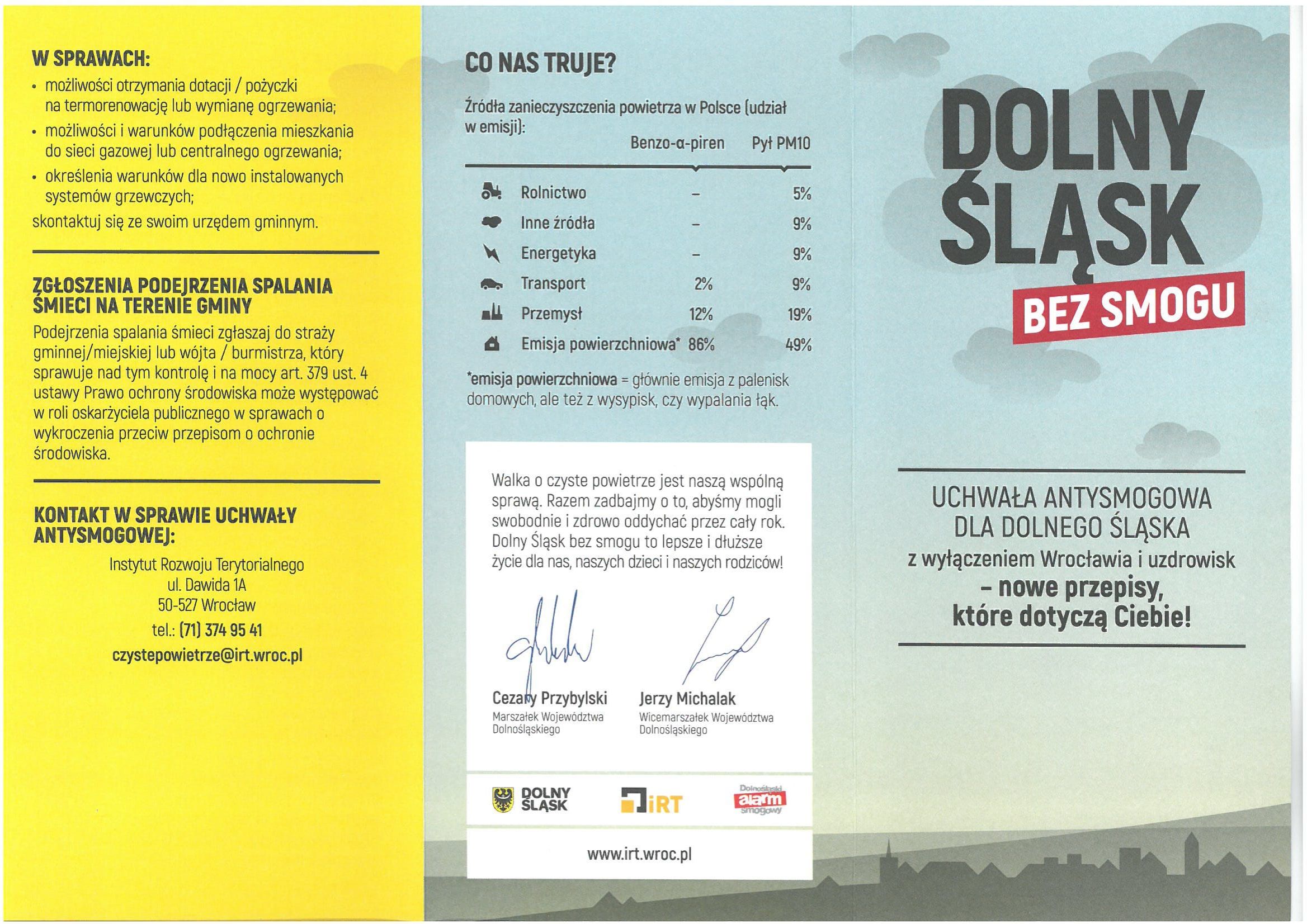 Wydział Środowiska i Gospodarowania Odpadami Urzędu Miasta Legnica dysponuje broszurami informacyjnymi dla mieszkańców na temat tego, jak ważna jest dbałość o to, czym oddychamy, natomiast my przekazujemy je Państwu w formie elektronicznej.