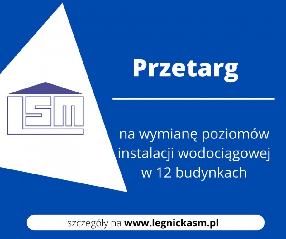 Legnicka Spółdzielnia Mieszkaniowa, ul. Gwiezdna 8, 59-220 Legnica, tel. 76-72-30-990, fax. 76-72-30-985 ogłasza przetarg nieograniczony na wymianę poziomów instalacji wodociągowej w 12 budynkach.