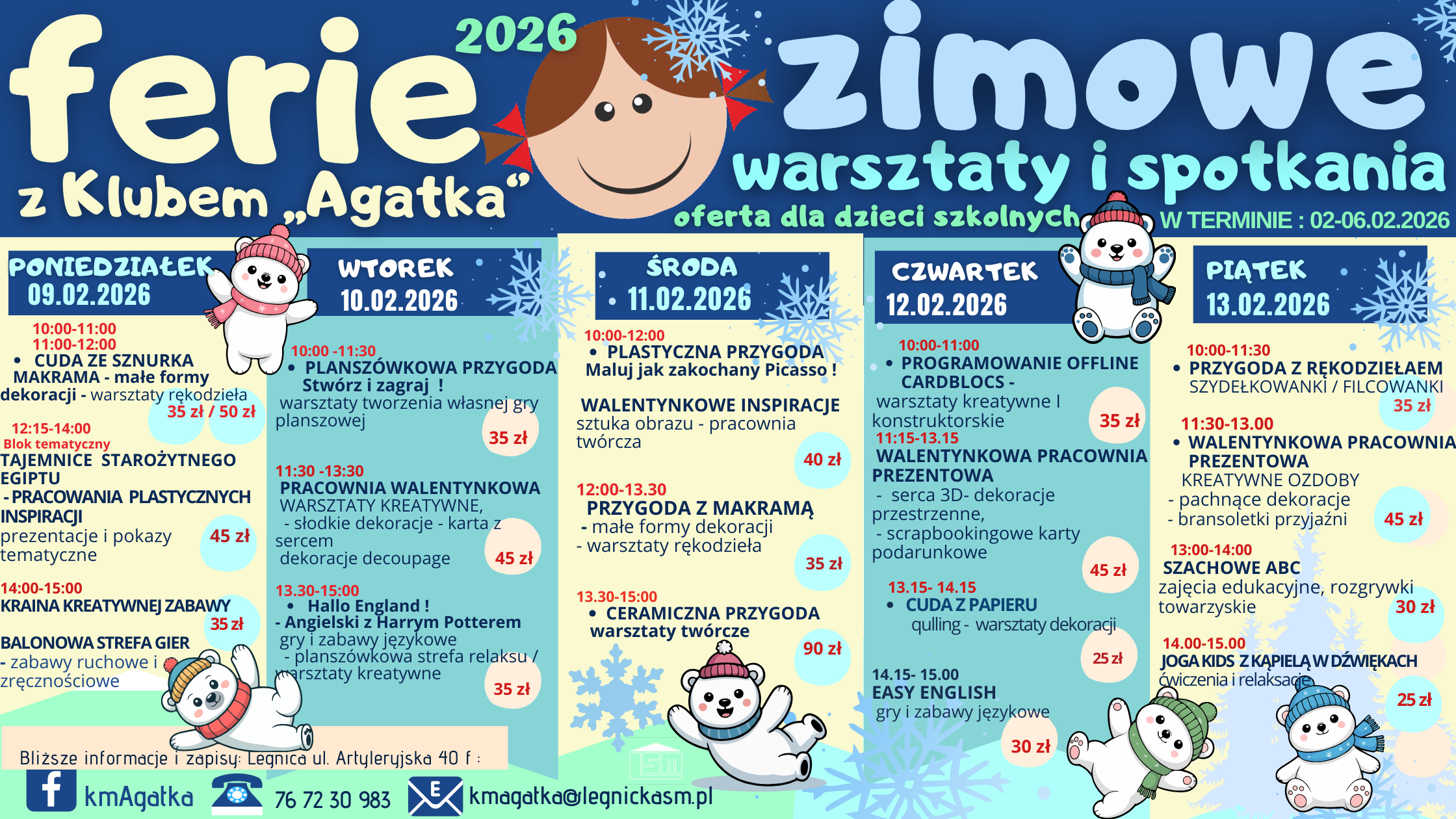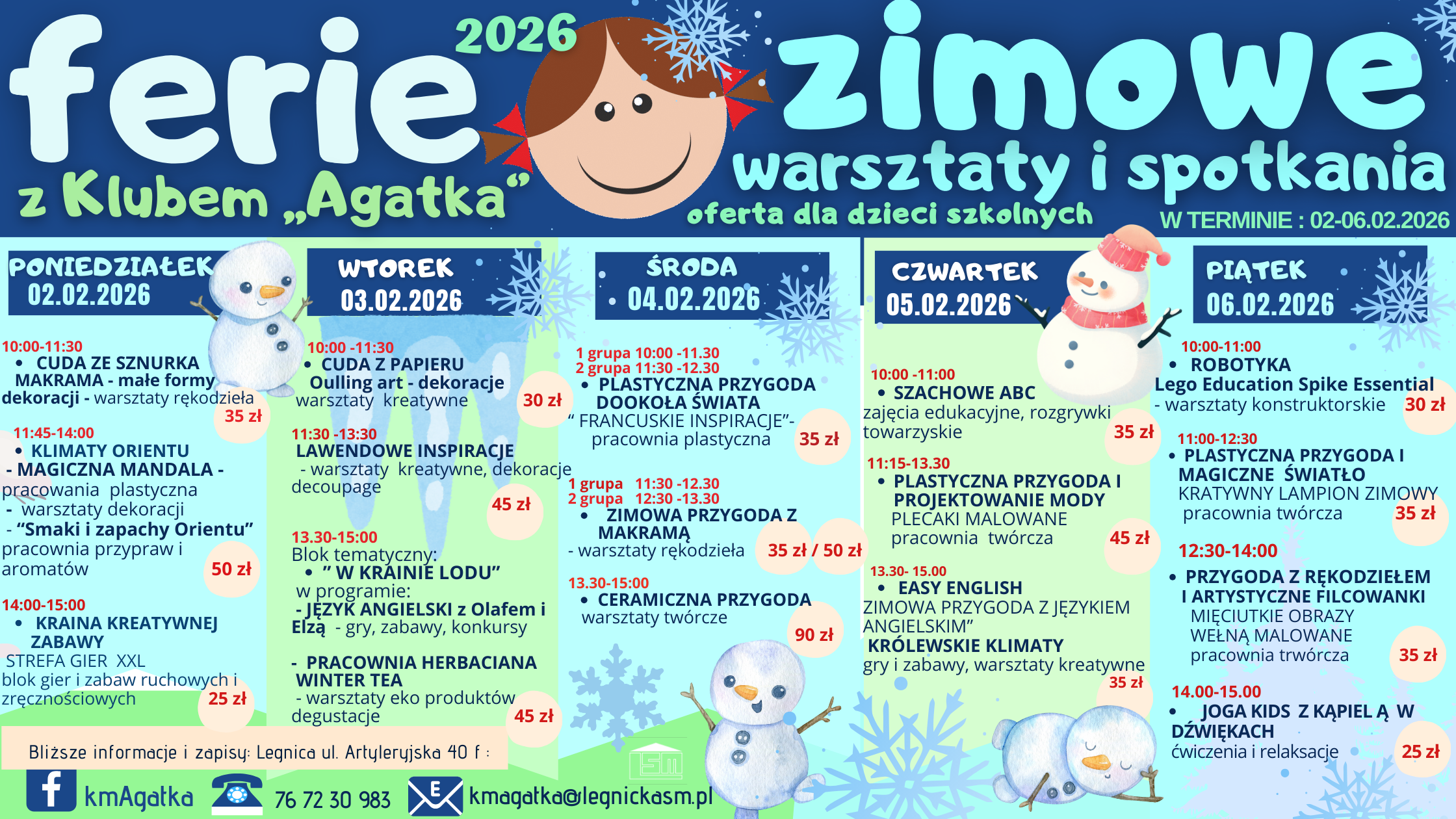 Klub Mieszkańców„ Agatka” z myślą o dzieciach szkolnych organizuje podczas ferii zimowych 2026 atrakcyjny program zajęć, warsztatów i spotkań tematycznych.