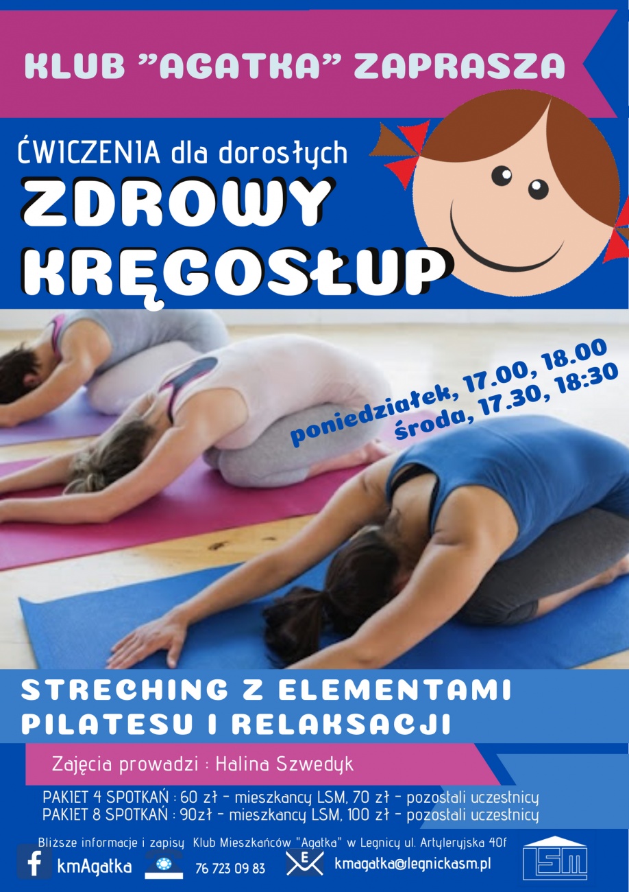 Zapraszamy serdecznie wszystkie panie zainteresowane ćwiczeniami typu " Zdrowy Kręgosłup". Zajęcia poprowadzi nasza doświadczona instruktorka Pani Halinka Szwedyk.