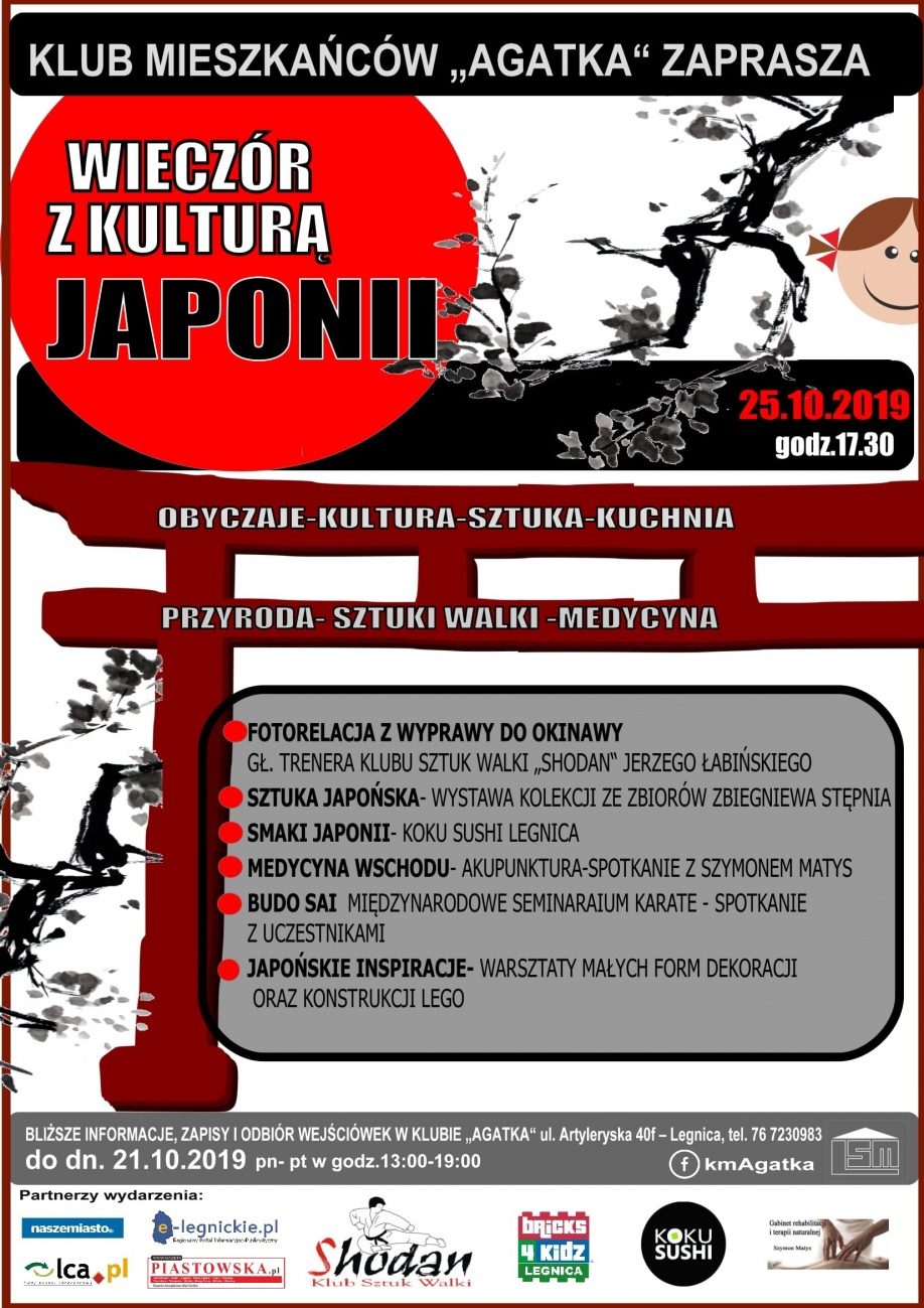 25 października Klub Mieszkańców " Agatka" organizuje kolejny wieczór z kulturą tym razem zaprasza do kraju kwitnącej wiśni. W programie wieczoru szereg atrakcji, tematów i smaków. Spotkanie uświetni między innymi wystawa sztuki japońskiej ze zbiorów legnickiego kolekcjonera Zbigniewa Stępnia, fotorelacja z podróży do Okinawy Jerzego Łabińskiego oraz prezentacja dot. Medycyny Wschodu autorstwa Szymona Matysa. Imprezie towarzyszyć będzie również spotkanie z kuchnią japońską za sprawą pokazu i przygotowanych delicjałów restauracji KOKU SUSHI Legnica. Zatem uczestnicy wieczoru przeniosą się do do kolebki karate, wyspy samurajów – Okinawy, poznają niektóre aspekty japońskiej kultury, obyczaje, kuchnię,medycynę naturalną i urzekającą przyrodę.