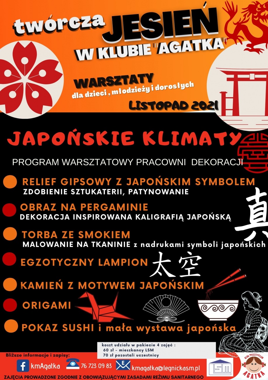 "Japońskie klimaty" to cykl listopadowych warsztatów organizowanych przez Klub Mieszkańców "Agatka" z myślą o dzieciach,młodzieży i osobach dorosłych. Na swoistą podróż do Kraju Kwitnącej Wiśni wybiorą się uczestnicy spotkań podczas warsztatów o różnorodnej tematyce, począwszy od inspiracji motywami kaligrafii japońskiej aż po sztukę przygotowania przysmaków sushi.Podczas warsztaów powstawać będą egzotyczne lampiony, galanteria z orientalnymi motywami oraz inne małe formy dekoracji.