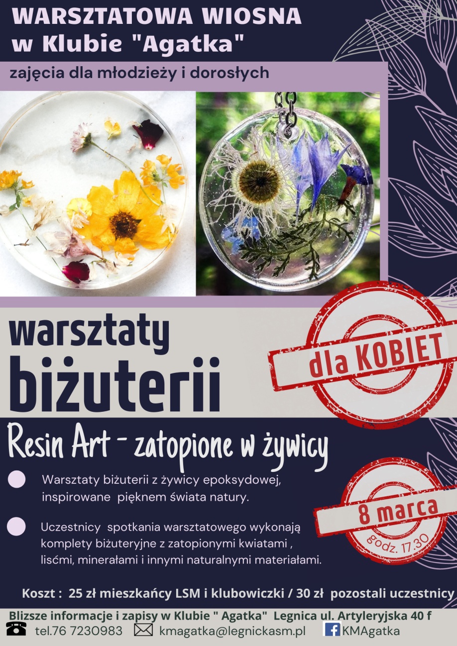 8 marca Klub Mieszkańców "Agatka" przygotowuje dla pań szereg propozycji, w tym wyjątkowe i efektowne warsztaty biżuterii z żywicy epoksydowej. Propozycja ta zakłada stworzenie własnej oryginalnej kolekcji z wykorzystaniem naturalnych materiałów, suszonych roślin i kwiatów. Spotkanie ma charakter otwarty, lecz obowiązują wcześniejsze zapisy.Zapraszamy serdecznie.