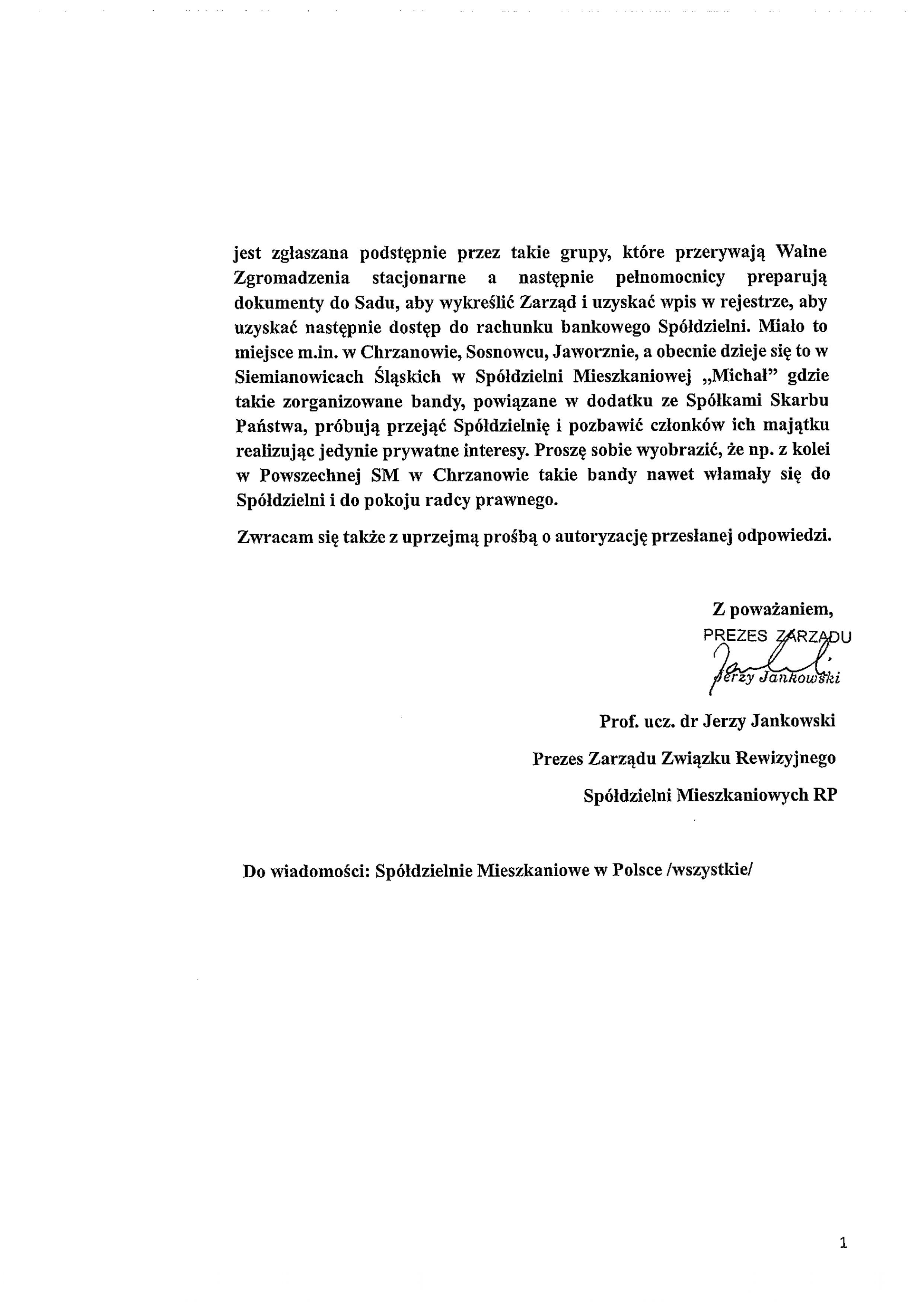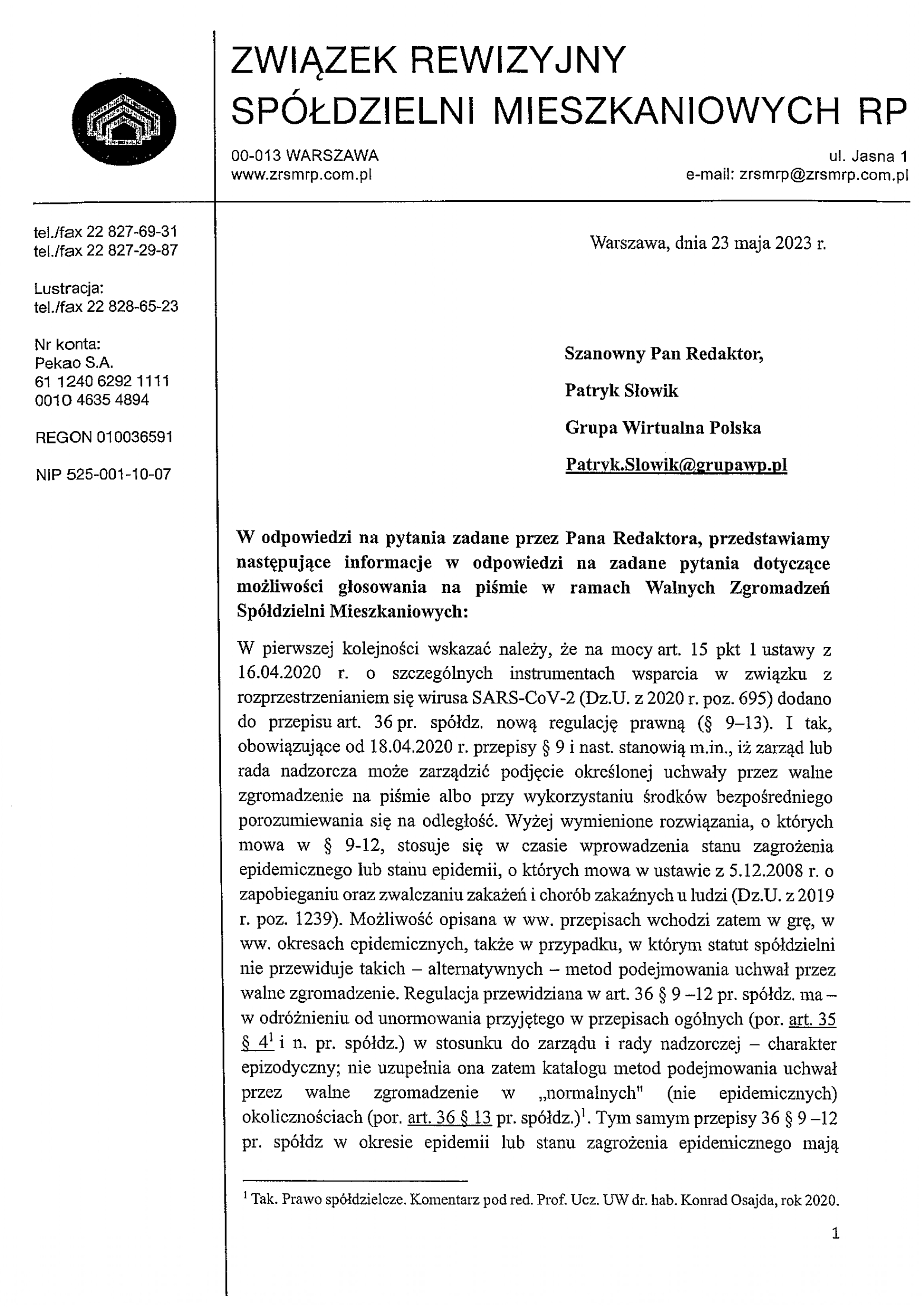 Zachęcamy członków Legnickiej Spółdzielni Mieszkaniowej do zapoznana się ze stanowiskiem Prezesa Związku Rewizyjnego Spółdzielni Mieszkaniowych RP, w którym szczegółowo wyjaśnia możliwości głosowania na piśmie w ramach Walnych Zgromadzeń Spółdzielni Mieszkaniowych.