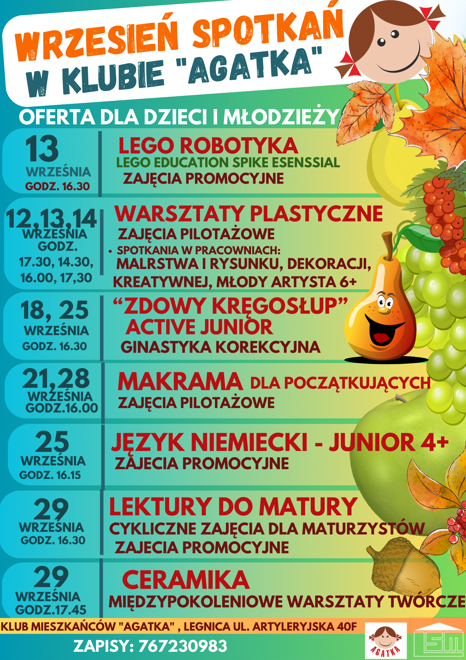 Klub Mieszkańców" Agatka" w nowym sezonie 2023/2024 począwszy od połowy września ponownie uruchamia działalność z szeregiem zajęć stałych i pilotażowych. Nowa oferta zakłada propozycje zarówno dla dzieci i młodzieży jak i osób dorosłych.