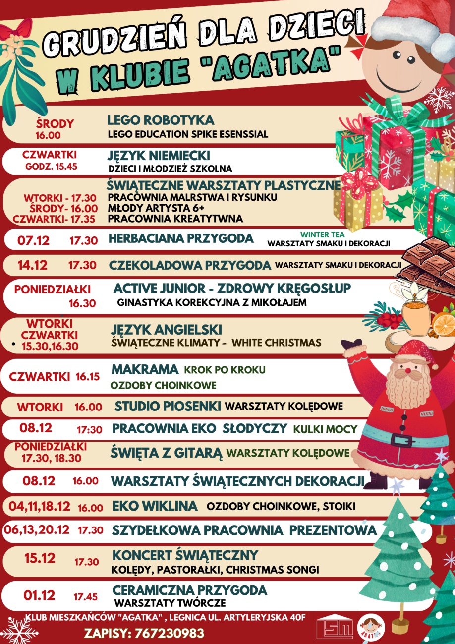 07 Gru Grudzień dla dzieci w klubie Agatka grudzień 7, 2023 wielkość czcionki Zmniejsz czcionkę Powiększ czcionkę Wydrukuj Email Tweet Dział: Aktualności Czytany 203 razy Powrót na górę