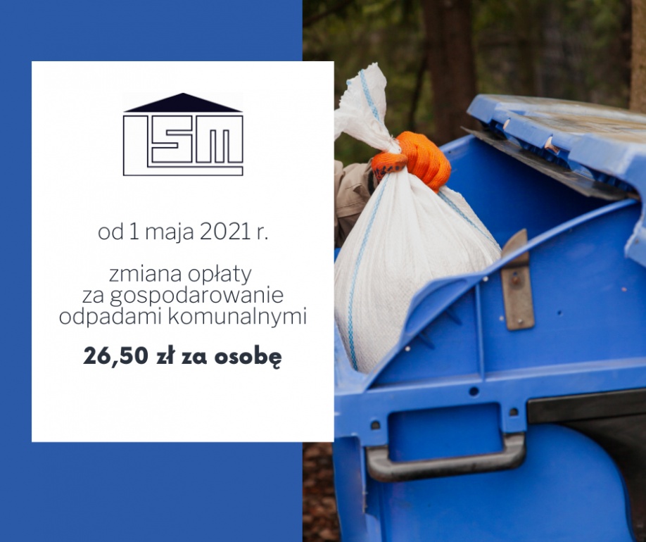 Z mocy Uchwały Rady Miejskiej Legnicy nr XXIX/358/21 z dnia 29.03.2021 r. w sprawie wyboru metody ustalenia opłaty za gospodarowanie odpadami komunalnymi oraz ustalenia wysokości stawek tej opłaty i wysokości zwolnienia, od 1.05.2021 r. zmienia się opłata za gospodarowanie odpadami komunalnymi z: 21,80 zł/osobę/ miesiąc na 26,50 zł/osobę/ miesiąc.