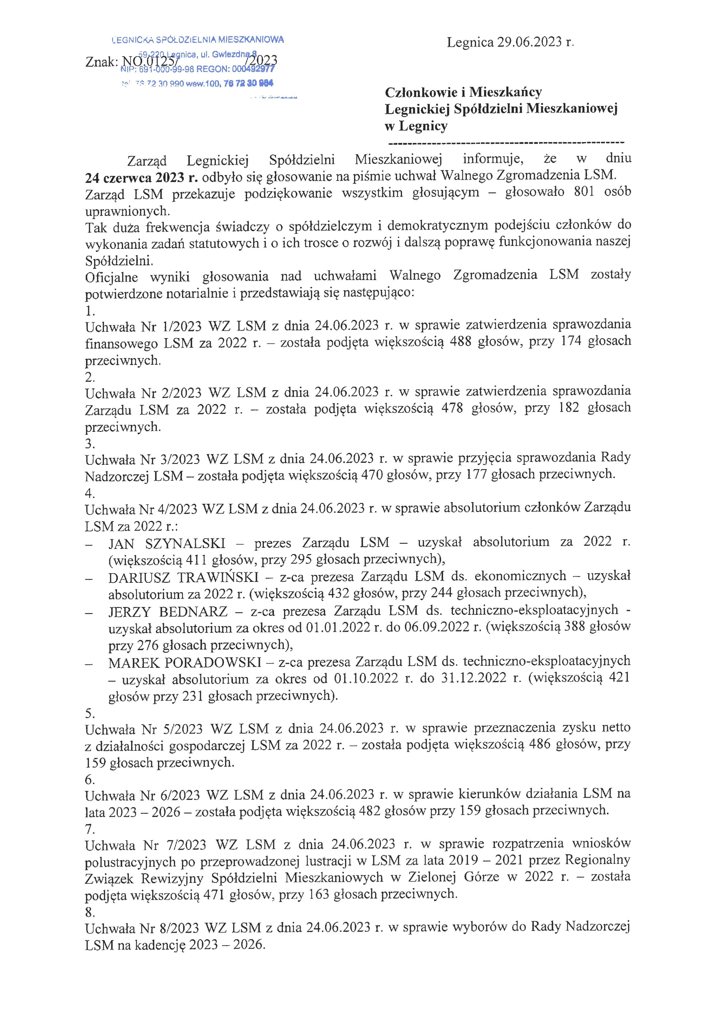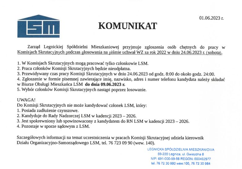 Wybory do Rady Nadzorczej LSM na kadencję 2023 – 2026 odbędą się w głosowaniu tajnym w dniu 24 czerwca 2023 r. (sobota).