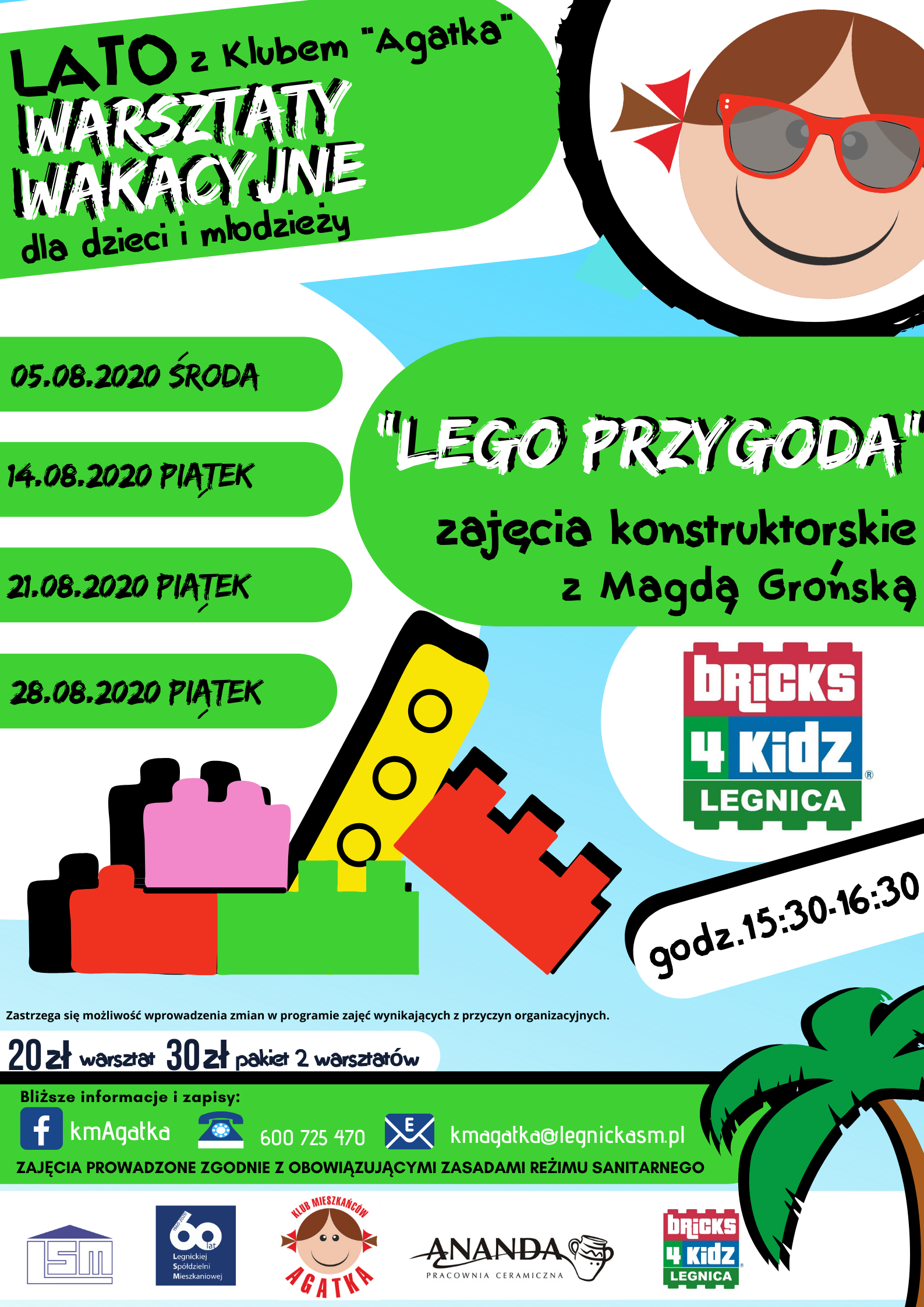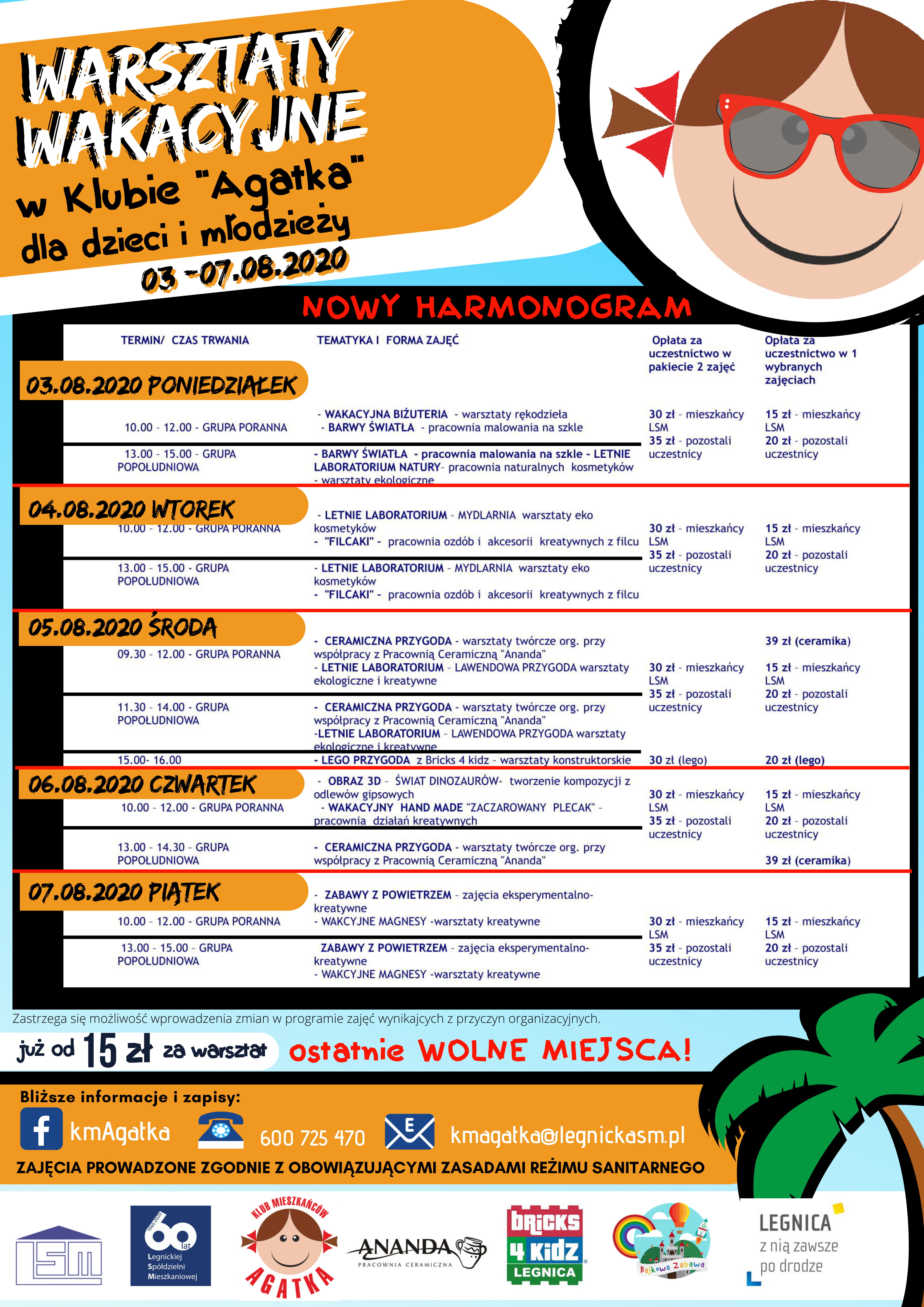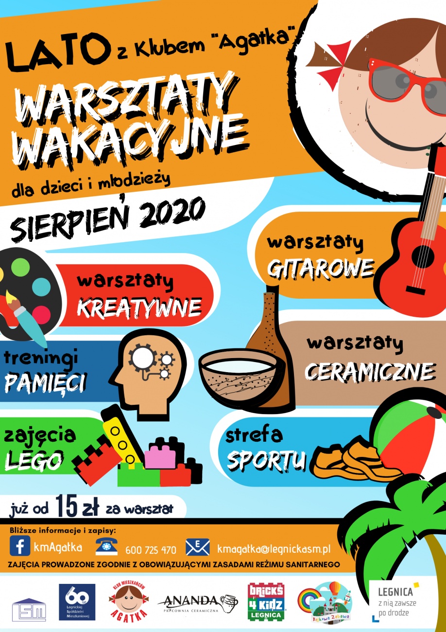 Klub Mieszkańców "Agatka" przygotowuje szereg warsztatów i zajęć wakacyjnych skierowanych do dzieci i młodzieży w miesiącu sierpniu. Zajęcia odbywać się będą w grupach porannych i grupach popołudniowych (do wyboru). Ze względu na obowiązujące reżimy sanitarne grupy będą bardzo kameralne liczące kilka osób. Zapisy przyjmowane są telefonicznie (600 725 470), mailowo (Ten adres pocztowy jest chroniony przed spamowaniem. Aby go zobaczyć, konieczne jest włączenie w przeglądarce obsługi JavaScript.) lub za pośrednictwem FB- KmAgatka FB. Serdecznie zapraszamy.