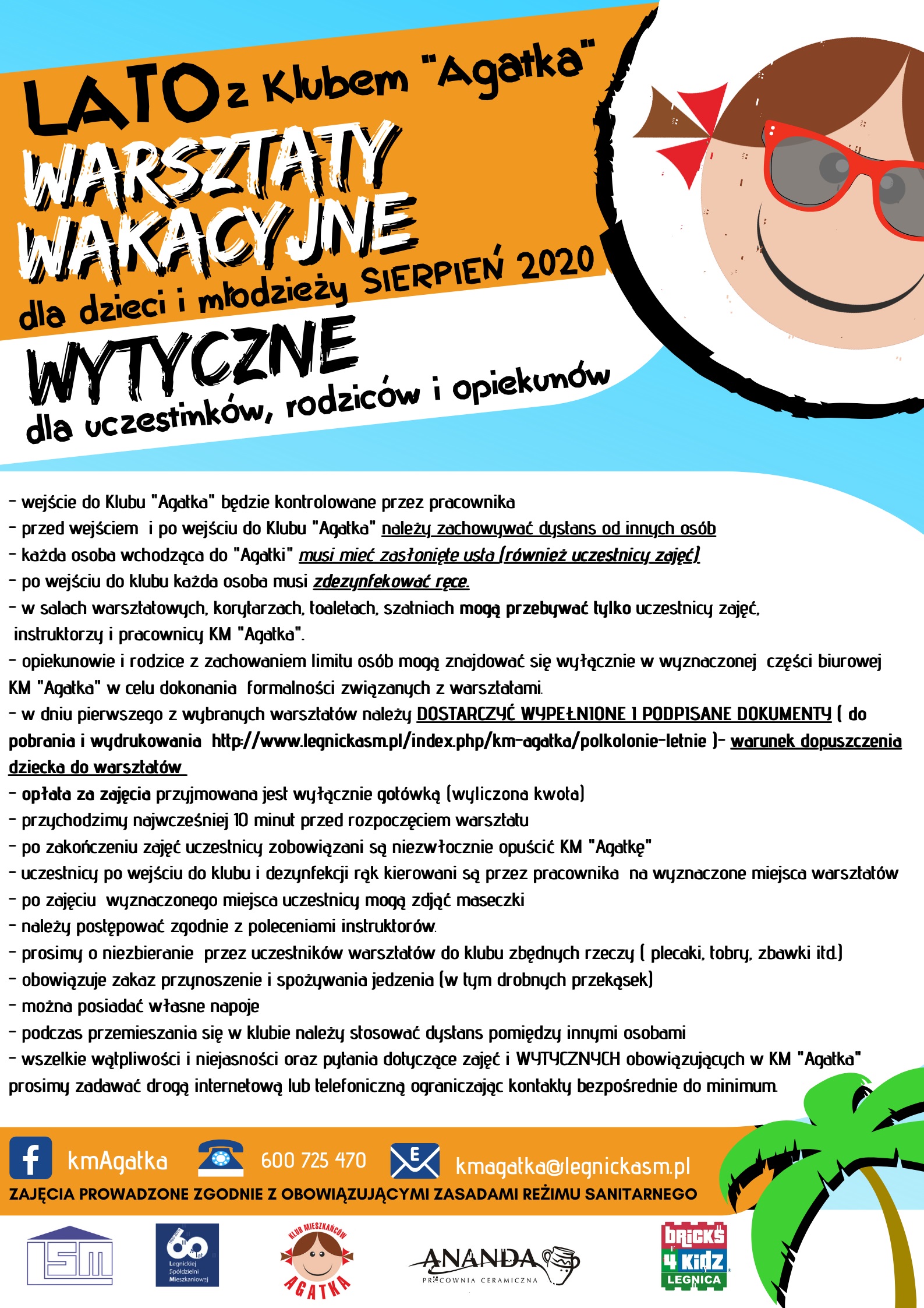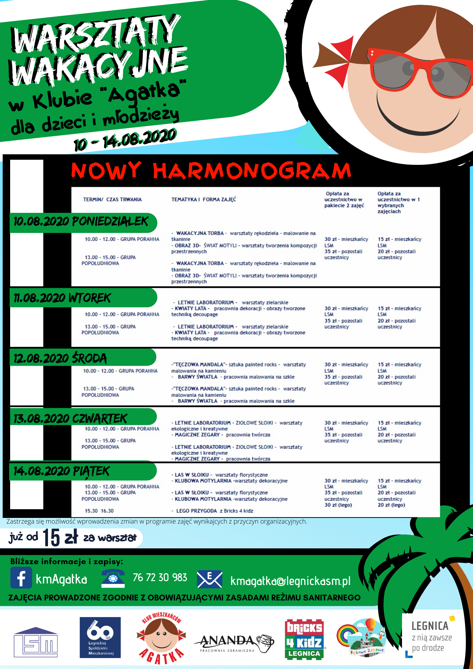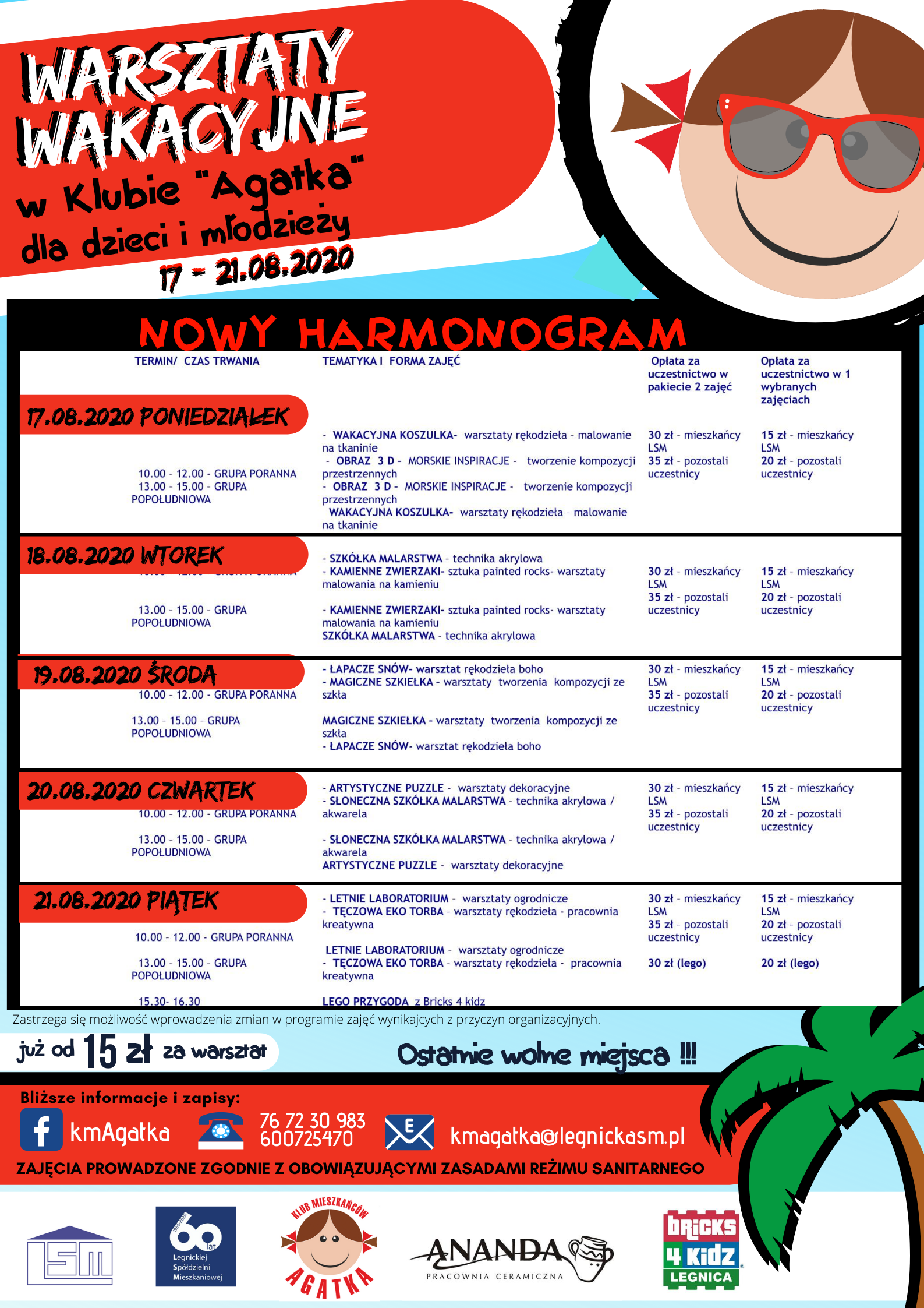 Klub Mieszkańców "Agatka" przygotowuje szereg warsztatów i zajęć wakacyjnych skierowanych do dzieci i młodzieży w miesiącu sierpniu. Zajęcia odbywać się będą w grupach porannych i grupach popołudniowych (do wyboru). Ze względu na obowiązujące reżimy sanitarne grupy będą bardzo kameralne liczące kilka osób. Zapisy przyjmowane są telefonicznie (600 725 470), mailowo (Ten adres pocztowy jest chroniony przed spamowaniem. Aby go zobaczyć, konieczne jest włączenie w przeglądarce obsługi JavaScript.) lub za pośrednictwem FB- KmAgatka FB. Serdecznie zapraszamy.