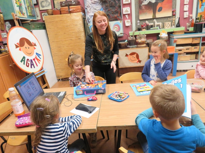W naszych zajęciach uczestniczą dzieci i młodzież ze szkół podstawowych. Uczymy języka w obrębie czterech podstawowych umiejętności: słuchania, mówienia, czytania i pisania. Pracujemy w kameralnych grupach spotkań (max. 15 osobowych), w określonych przedziałach wiekowych uczestników. Zajęcia w założeniu i praktyce mają pomagać w rozwoju językowym oraz uzupełniać naukę szkolną w oparciu o dodatkowe materiały ćwiczeń i publikacje. Bawimy się z językiem i pomagamy w trudnościach szkolnych.