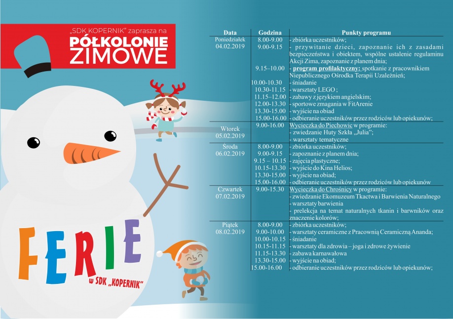 04 Lut Półkolonie w Koperniku - turnus II - rozkład jazdy luty 4, 2019 wielkość czcionki Zmniejsz czcionkę Powiększ czcionkę Wydrukuj Email Tweet Dział: SDK Kopernik Czytany 1393 razy Powrót na górę