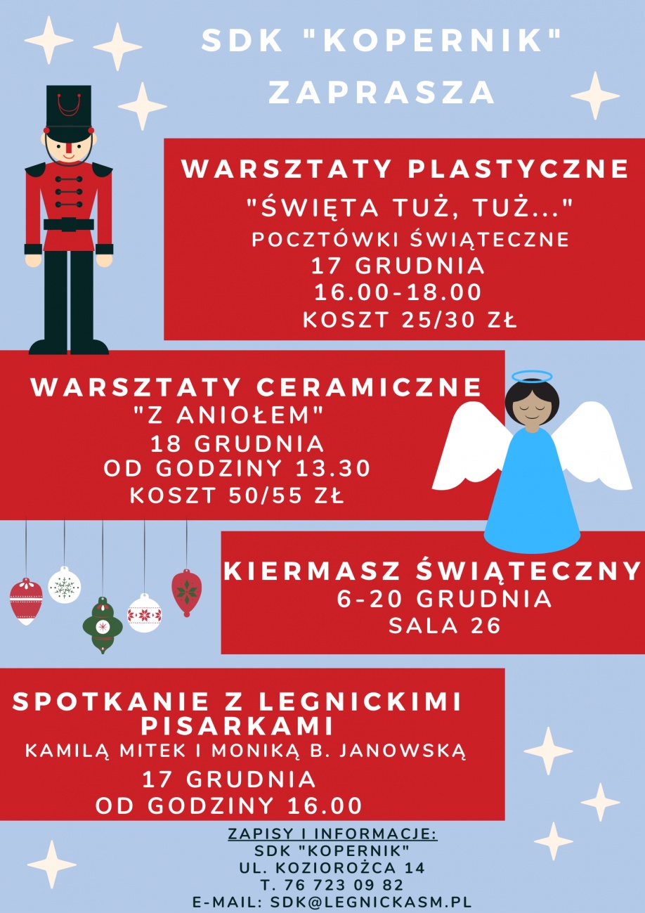 Zapraszamy wszystkich na wyjątkowe spotkania przedświąteczne w naszym domu kultury. Przyjmujemy już zapisy na warsztaty plastyczne, podczas których zostaną wykonane niepowtarzalne kartki bożonarodzeniowe. W świąteczny klimat wprowadzą nas również warsztaty ceramiczne, na których stworzymy piękne anioły.