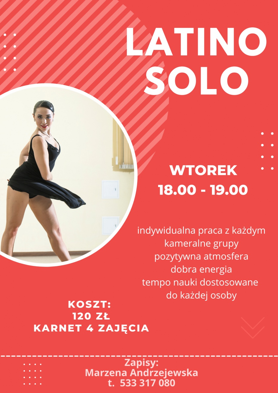 Latino solo to zajęcia taneczne dedykowane przede wszystkim do pań, które pragną wzmocnić swoją pewność siebie i odkryć na nowo kobiecość. Lekcje tańca latino solo łączą w sobie zmysłowość, pasję i ekspresję. Uczestniczki zajęć zapoznają się z podstawowymi krokami tańców latynoamerykańskich.