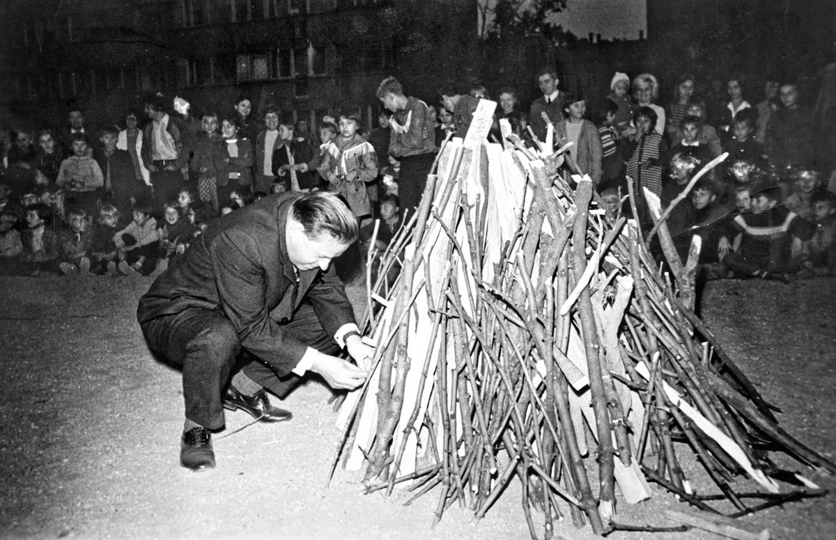 Władysław Zdzymira jedną zapałką rozpala ognisko podczas Harcerskiego Święta Osiedla przy ul. Artyleryjskiej, Osiedle Asnyka 1973 rok, mat. arch. LSM