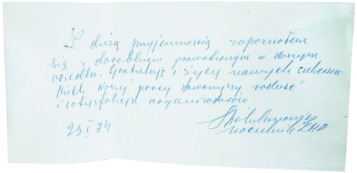 Pamiątkowy wpis Stanisława Bohdanowicza – Naczelnika ZHP: „Z dużą przyjemnością zapoznałem się z dorobkiem prowadzonym w Waszym osiedlu. Gratuluję i życzę nowych sukcesów. Niech Waszej pracy towarzyszy radość i satysfakcja organizatorów.”, 23. 01. 1974 r., mat. arch. LSM